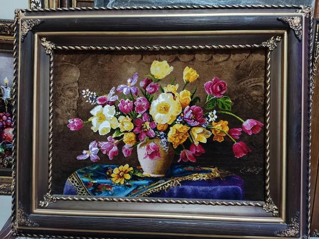 تابلو فرش دستباف گل وگلدان کتیبه چله نخ گل ابریشم اندازه ۵۰/۷۰